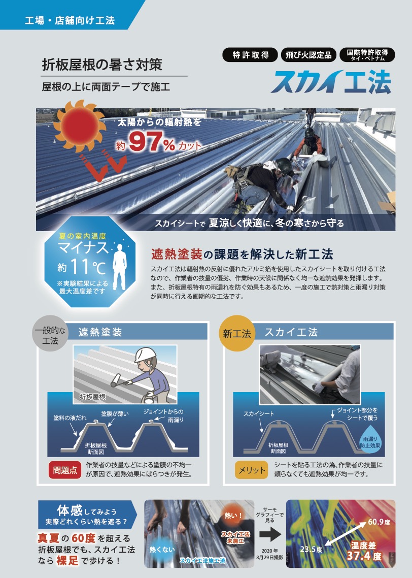 既存屋根表面に遮熱シートを直接接着する工法をスカイ工法と言います。